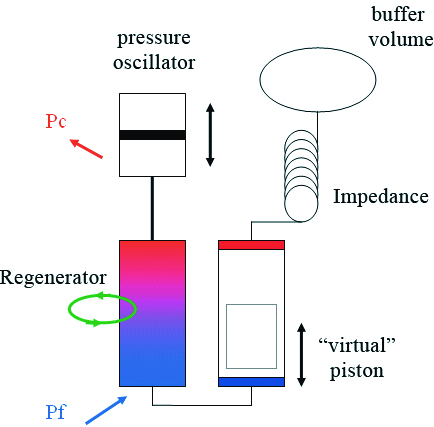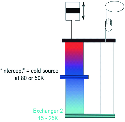 Deux architectures sont décrites ci-dessous qui répondent à toutes les exigences : la première "interceptée" et l’autre "à deux étages". Dans la configuration "interceptée" (figure 1), un point intermédiaire du régénérateur est conditionné thermiquement à environ 80 K par une intersection. Pour les missions spatiales suffisamment éloignées de la Terre, il est possible d’obtenir des températures aussi basses que 50 K en utilisant des radiateurs passifs, qui sont de grandes zones rayonnant leur chaleur dans le froid de l’espace à 2,7 K. En laboratoire, cet effet de pré-refroidissement est obtenue en utilisant un cryoréfrigérateur supplémentaire. L'avantage de cette architecture est qu'elle limite les pertes de régénérateur. Avec cette configuration, nous avons 300 mW de puissance disponible à 20 K. Cette puissance peut être dissipée par des composants électroniques, ou par un détecteur, ou utilisée pour pré-refroidir une autre machine. Il peut également être utilisé pour refroidir le plan focal d'un télescope.