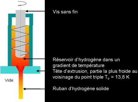 L'extrusion se fait dans un état quasi solide au voisinage du point triple, point où le solide, le liquide et le gaz sont en équilibre. Pour l'hydrogène, le point triple correspond à une température Ttr = 13,8 K et une pression Ptr = 70,4 hPa.