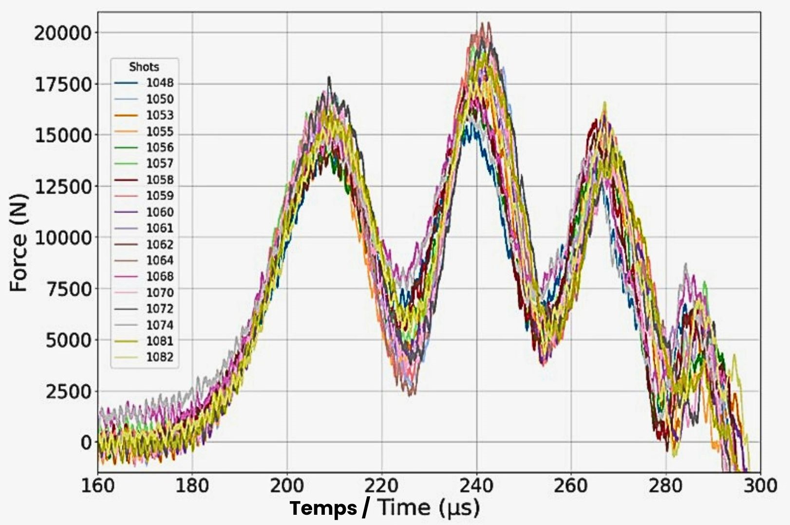 Un tel système de mesure de la force d’impact de solides cryogéniques est inédit. Des campagnes expérimentales ont été menées avec les paramètres de formation et d’accélération requis pour ITER. Une étude de reproductibilité avec 18 tirs d’hydrogène solide, formés et accélérés suivant les mêmes paramètres à l’aide d’un système de contrôle commande développé par le DSBT, a permis d’obtenir des résultats prometteurs pour l’étude des impacts de solides cryogéniques. Ces premiers résultats mettent en avant des paramètres importants à maitriser autant d’un point de vue du dispositif expérimental (diamètre de la barre, système d’acquisition) que concernant les paramètres de fabrication des solides cryogéniques (température, pression et débit d’injection). D’ores et déjà, nous avons montré la capacité de filmer l’impact des glaçons d’hydrogène solide lancés à 500 m/s (Figure 1) et de mesurer l’évolution temporelle de leur force d’impact (Figure 2).